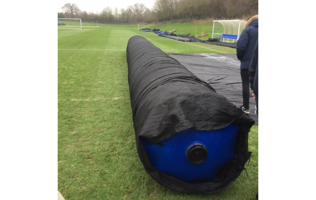 Inflatable air roller in action with a frost cover – streamlining winter pitch protection.